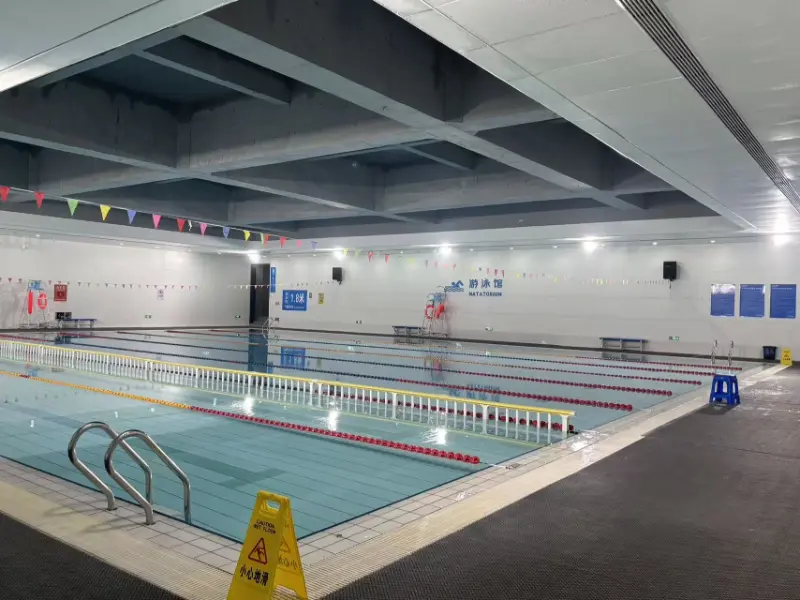 Tá córas painéil scála éisc miotail ag taobh amuigh den linn snámha, rud a chruthaíonn éifeacht solais agus scáth cosúil le scála a athraíonn le cuaire an éadan agus treo solas na gréine, ag cur feabhas ar "sreabhadh uisce." Tá struchtúr díon iomlán an limistéir linn snámha faoi dhíon nochta, le truss a chuimsíonn 48 méadar, ag cur béime ar léiriú follasach loighic struchtúrach agus ag neartú scála spásúil agus braistint cumhachta an ionaid spóirt. Tá dhá linn san ionad: linn comórtais agus linn oiliúna. Tá an linn comórtais 50 méadar ar fad agus 25 méadar ar leithead, le 8 lána; tá an linn traenála 50 méadar ar fad agus 17 méadar ar leithead, le 6 lána. Tá an dá linn 2 mhéadar ar doimhneacht.